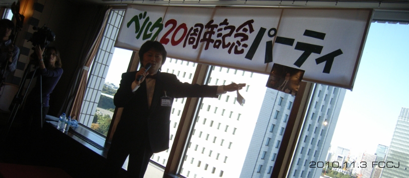 2010年11月3日文化の日、「有楽町で酔いましょう」「皇居を見下ろしながら」を合い言葉(?)に電気ビル20Fの日本外国特派員協会(記者会見広間)に、ベルクのお客様と業者さん、職人、現スタッフ、OBスタッフ、メディア関係者合わせて300人が集結、開店20周年を盛大に祝いました。