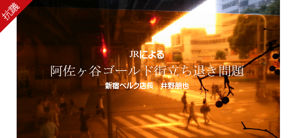 先日、阿佐ヶ谷駅そばの高架下商業ビル「ゴールド街」にいってまいりました。家主はやはりJR。話には聞いていましたが、想像以上の「シャッター街」にびっくりしました。2階なんて、営業中が老舗の喫茶店1店舗のみ。建て替えを口実に執拗に出て行けと言われ、店が次々に消えていきました。家主は新しい店を入れず、一時的な催事場ももうけない。しかし実は、建て替えというのは嘘(でなければ空耳?)で、改修の予定しかないというのが最近明かされました。店はまばらに残るだけ。意図的につくられたシャッター街です。中には頑張っているお店もあるし、イチオシのお店も見つけましたが、こういう商業施設は、店がいくつか抜けるとそれだけでうらぶれます。いくら一等地でも、その雰囲気は商売上致命的です。
