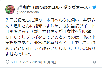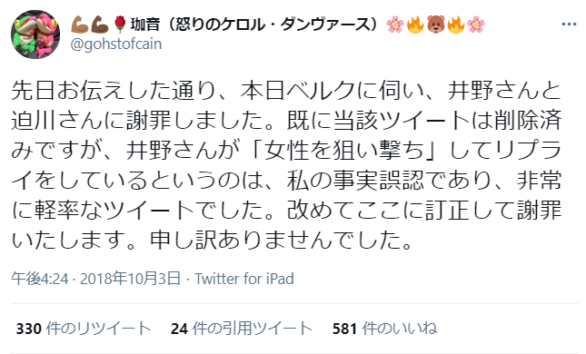 珈音さんのデマ撤回と謝罪により炎上は一旦おさまりかけましたが、ツイッターフェミニズムの方たちに再度火種が仕掛けられ、珈音さんもご自分のブログで「約束は守られなかった」と私を非難して、炎上は再び一段と激しく燃えました。(店長)