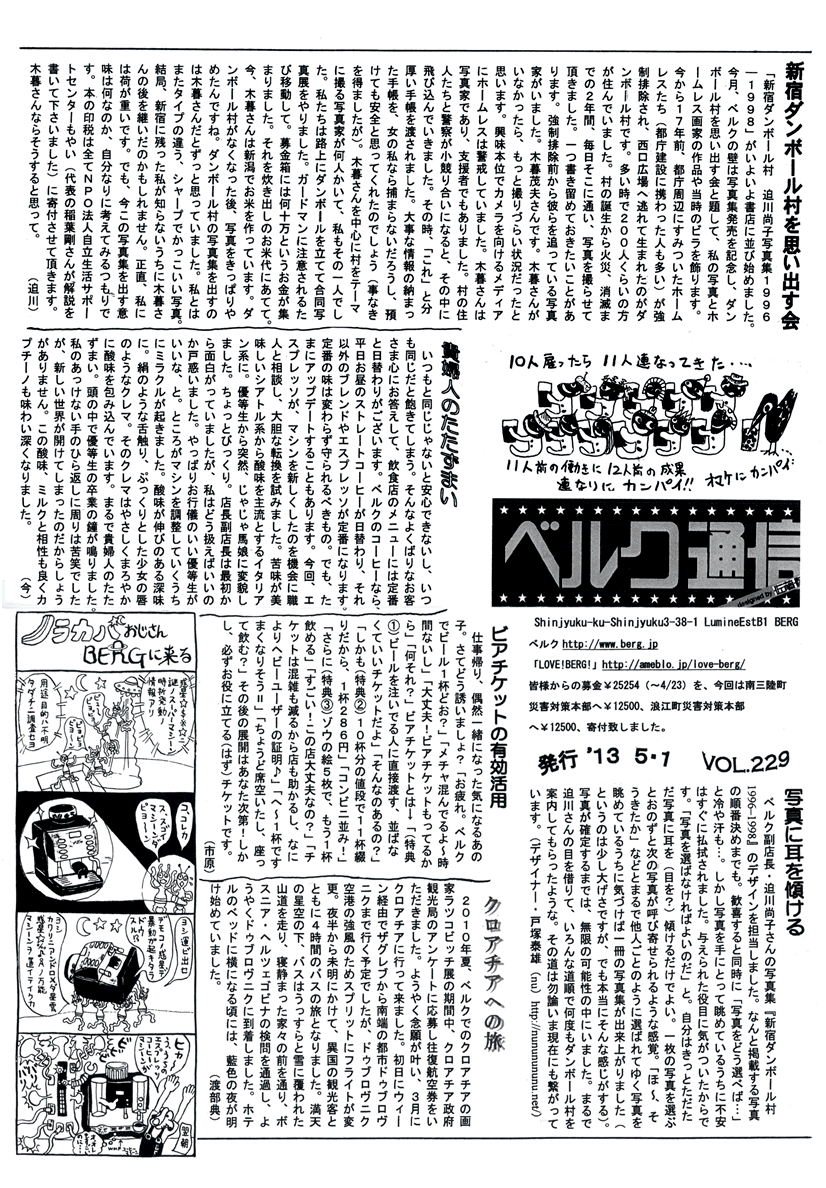 「新宿ダンボール村 迫川尚子写真集1996-1998」がいよいよ書店に並び始めました。来月、ベルクの壁は写真集発売を記念し、ダンボール村を思い出す会と題して、私の写真とホームレス画家の作品や当時のビラを飾ります。今から17年前、都庁周辺にすみついたホームレスたち(都庁建設に携わった人も多い)が強制排除され、西口広場へ逃れて生まれたのがダンボール村です。多い時で200人くらいの方が住んでいました。村の誕生から火災、消滅までの2年間、毎日そこに通い、写真を撮らせて頂きました。一つ書き留めておきたいことがあります。強制排除前から彼らを追っている写真家がいました。木暮茂夫さんです。木暮さんがいなかったら、もっと撮りづらい状況だったと思います。興味本位でカメラを向けるメディアにホームレスは警戒していました。木暮さんは写真家であり、支援者でもありました。村の住人たちと警察が小競り合いになると、その中に飛び込んでいきました。その時、「これ」と分厚い手帳を渡されました。大事な情報の納まった手帳を、女の私なら捕まらないだろうし、預けても安全と思ってくれのでしょう(事なきを得ましたが)。木暮さんを中心に村をテーマに撮る写真家が何人かいて、私もその一人でした。私たちは路上にダンボールを立てて合同写真展をやりました。ガードマンに注意されるたび移動して。募金箱には何十万というお金が集まりました。それを炊き出しのお米代にあてて。今、木暮さんは新潟でお米を作っています。ダンボール村がなくなった後、写真をきっぱりやめたんですね。ダンボール村の写真集を出すのは木暮さんだとずっと思っていました。私とはまたタイプの違う、シャープでかっこいい写真。結局、新宿に残った私が知らないうちに木暮さんの後を継いだのかもしれません。正直、私には荷が重いです。でも、今この写真集を出す意味は何なのか、自分なりに考えてみるつもりです。本の印税は全てNPO法人自立生活サポートセンターもやい(代表の稲葉剛さんが解説を書いて下さいました)に寄付させて頂きます。木暮さんならそうすると思って。